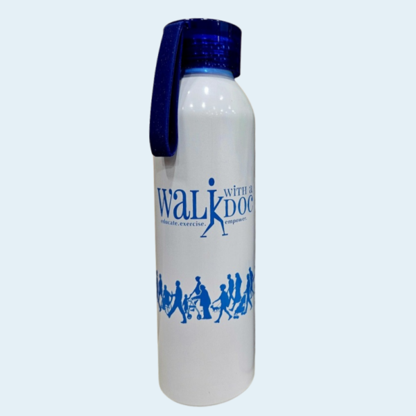 This water bottle is made of aluminum, holds up to 22 oz. of your favorite beverage, and measures 9″ tall. Features include a screw‐on, spill‐resistant lid, and an easy carry handle. This is BPA free and meets FDA requirements. Hand wash is recommended for proper care.